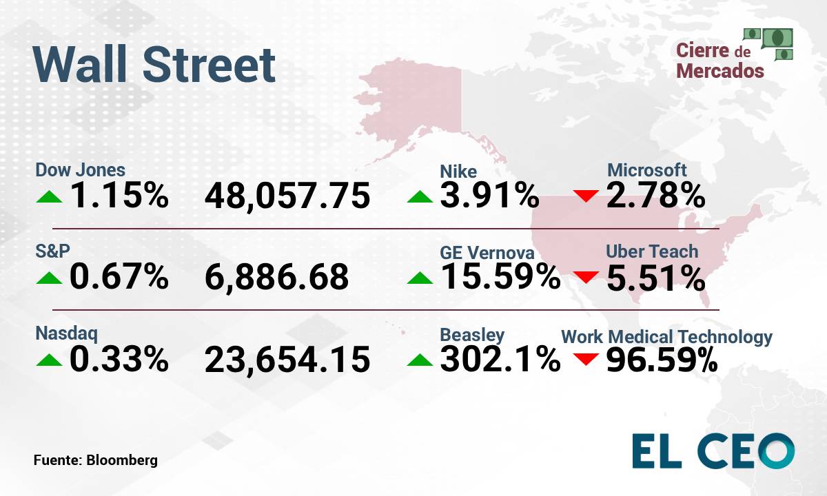 El S&P 500 ganó 0.67%, a 6,886.68 puntos, mientras que el Nasdaq Composite subió 0.33%. a 23,654.15 unidades. Por su parte, el Dow Jones avanzó 1.15%, a 48,057.75 puntos, de acuerdo con Bloomberg.