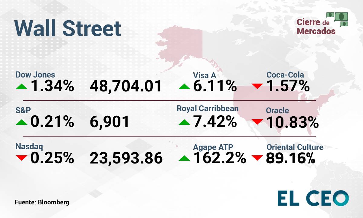 El S&P 500 ganó 0.21%, a 6,901 puntos, mientras que el Nasdaq Composite cayó 0.25%. a 23,593.86 unidades. Por su parte, el Dow Jones avanzó 1.34%, a 48,704.01 puntos, de acuerdo con Bloomberg.