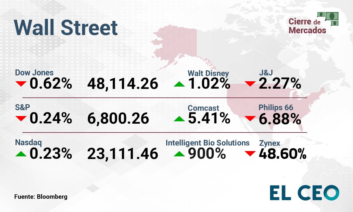 El S&P 500 perdió 0.24%, a 6,800.26 puntos, mientras que el Nasdaq Composite ganó 0.23%, a 23,111.46 unidades. Por su parte, el Dow Jones retrocedió 0.62%, a 48,114.26 puntos, de acuerdo con Bloomberg.