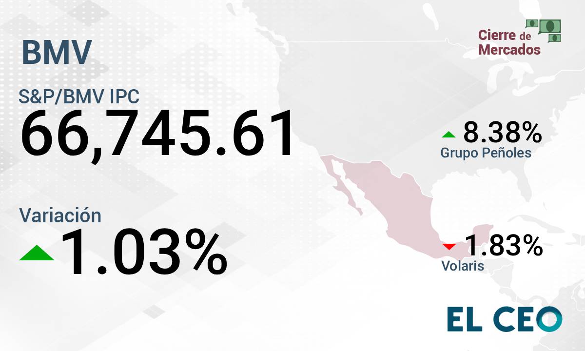 El Índice de Precios y Cotizaciones (IPC) de la Bolsa Mexicana de Valores (BMV) cerró la sesión de este lunes con una ganancia de 1.03%, a 66,745.61 puntos, de acuerdo con datos de la propia institución bursátil.