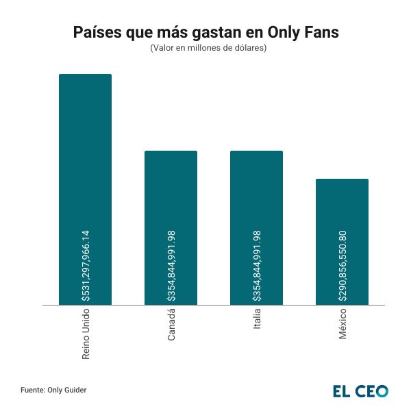 De acuerdo con Only Guider, una consultora que se encarga de analizar lo que ocurre con dicha plataforma, reveló que en 2025, México se colocó como el quinto país en el mundo donde los usuarios destinan más dinero a la plataforma, con un gasto total de 290,856 millones de dólares (mdd), representado un 19.12% más que lo adquirido en 2024.