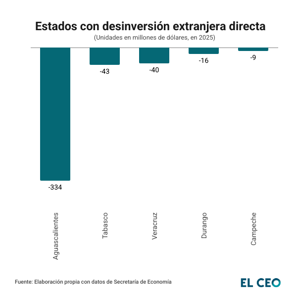 De acuerdo con datos de la Secretaría de Economía (SE), Aguascalientes fue el estado que registró una mayor salida de capital por 334 millones de dólares (mdd). Tabasco se ubicó como el segundo estado con una caída de 43 mdd.