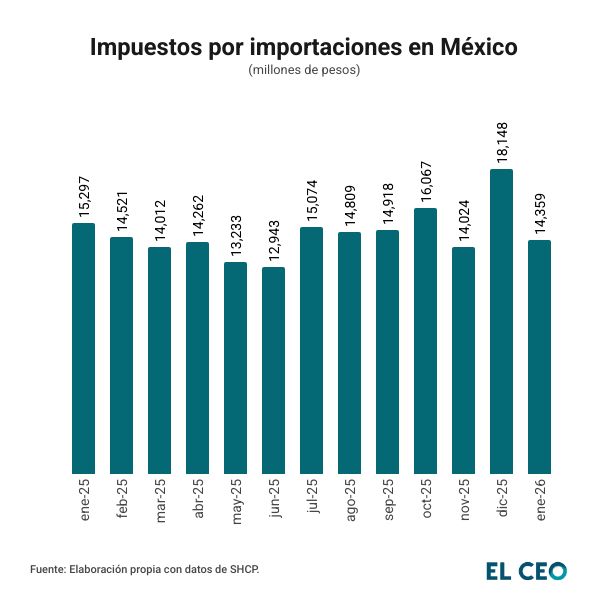 En diciembre de 2025, la recaudación por importaciones mostró una variación real positiva de 46.5%, impulsada por el flujo de mercancías de fin de año y el adelanto de operaciones ante la incertidumbre comercial, a 18,148 mdp.