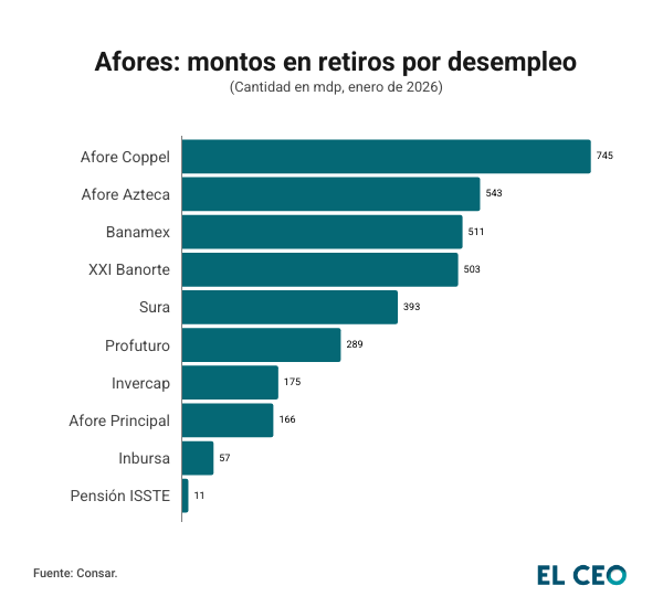 Entre las administradoras que registraron los mayores montos de retiro por desempleo en el primer mes del año destacan: Afore Coppel con 745 mdp; Azteca, 543 mdp; Banamex, 511 mdp, y Afore XXI Banorte con 503 mdp.