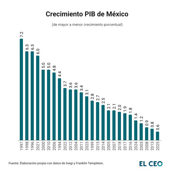 La economía mexicana cerró 2025 en terreno positivo, pero dejó un sabor agridulce. El Producto Interno Bruto (PIB) anotó un crecimiento anual de apenas 0.6% —de acuerdo con cifras originales—, consolidándose como el desempeño más débil para un año desde 1994, de acuerdo con un análisis de Franklin Templeton.