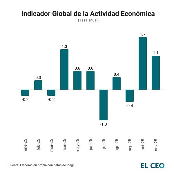 La economía de México volvió a confirmar que 2025, más que un año de aceleración, fue uno de enfriamiento. La actividad económica se desaceleró a 1.1% anual en noviembre, desde el 1.7% registrado en octubre, de acuerdo con el Indicador Global de la Actividad Económica (IGAE) del Instituto Nacional de Estadística y Geografía (Inegi).