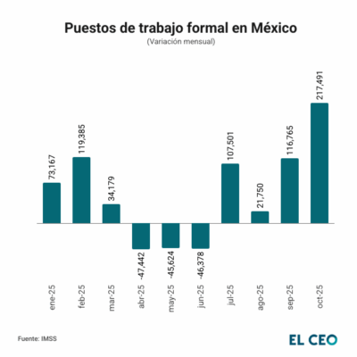La creación de empleo formal en México reportó un sólido crecimiento mensual de 217,419 nuevos puestos en octubre, siendo la cifra más alta para cualquier mes en registro, de acuerdo con el Instituto Mexicano del Seguro Social (IMSS).