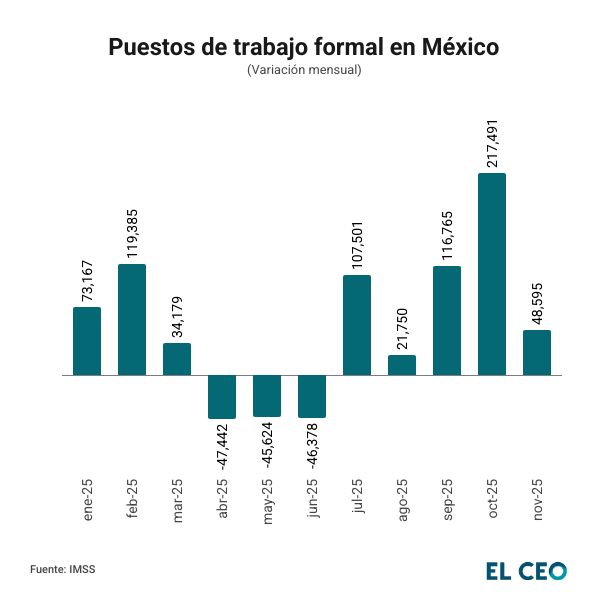 En noviembre se crearon 48,595 nuevos empleos formales, con lo que se acumulan 599,389 puestos afiliados en los que va del 2025, un 2.7% más que en el mismo periodo de 2024.