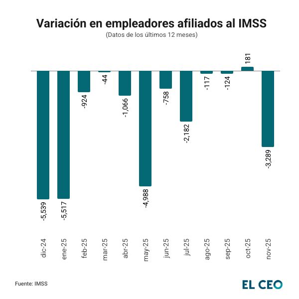 Esto refleja un riesgo para el empleo formal en México, ya que tan sólo en noviembre se registró una salida de 3,289 patrones afiliados, posicionándose como el segundo mes con la mayor caída en este rubro en lo que va del 2025, sólo detrás de mayo, cuando 4,988 empleadores se dieron de baja.