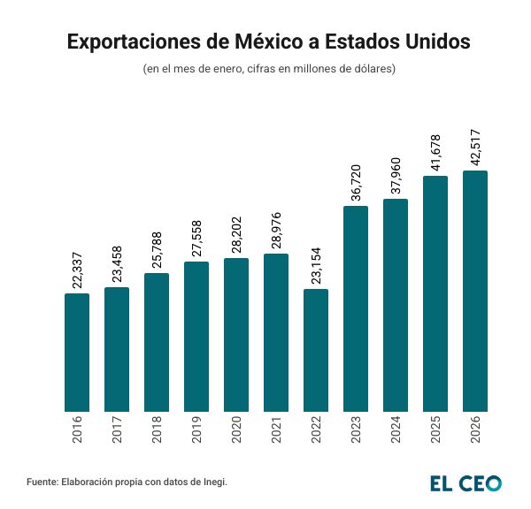 Las exportaciones mexicanas hacia Estados Unidos anotaron un máximo histórico para un inicio de año, al sumar 42,517 millones de dólares (mdd) durante enero, respecto a los 41,678 mdd registrados en el mismo periodo de 2025, de acuerdo con datos del Departamento de Comercio de Estados Unidos.