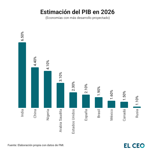 Para China, otra de las principales economías del mundo, se prevé un crecimiento de 4.4% en 2026, una ligera baja frente al 4.5% previo, mientras que para 2027 se proyecta una expansión de 4.0%.