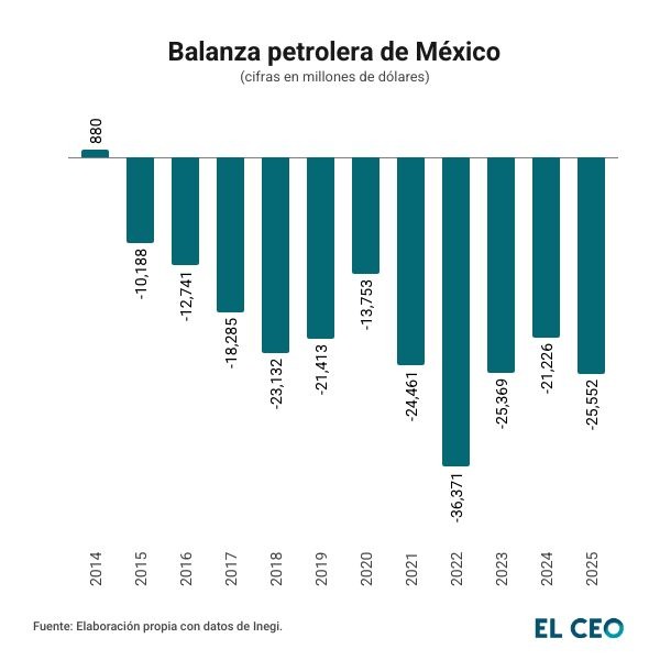 La balanza petrolera de México sumó en 2025 un año más con déficit, un comportamiento que contrasta con el récord de los envíos que se hicieron desde el país, de acuerdo con el dato preliminar de la balanza comercial que publicó el Instituto Nacional de Estadística y Geografía (Inegi).
