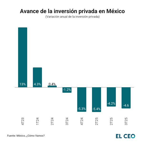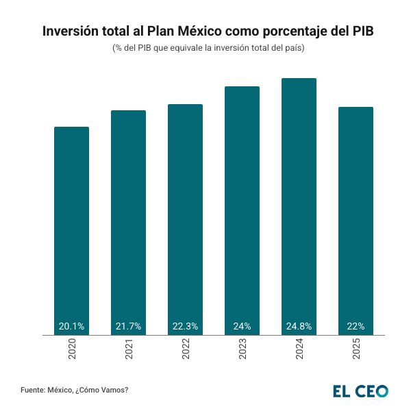 De acuerdo con datos de México, ¿Cómo Vamos?, al tercer trimestre de 2025 la inversión total de México alcanzó el 22% del Producto Interno Bruto (PIB) nacional, lo que significó un retroceso con respecto al mismo periodo de 2024, cuando llegó a el 24.8% del PIB,