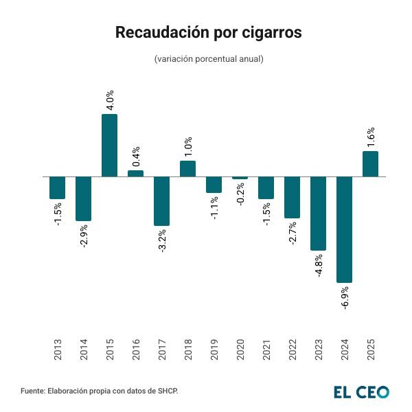 La Secretaría de Hacienda y Crédito Público (SHCP) no reporta desde el 2015-2016 dos años consecutivos con crecimiento en la captación del IEPS a cigarros, pero esa historia puede cambiar este 2026, y sumarse al avance de 1.6% anual del año pasado.