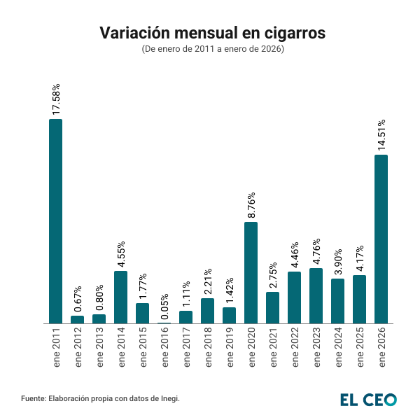 De acuerdo con el Instituto Nacional de Estadística y Geografía (Inegi), la variación mensual del precio de los cigarros en México fue de 14.51% en enero, el nivel más alto en los últimos 15 años. La cifra solo es superada por enero de 2011, cuando el aumento mensual alcanzó 17.58%.