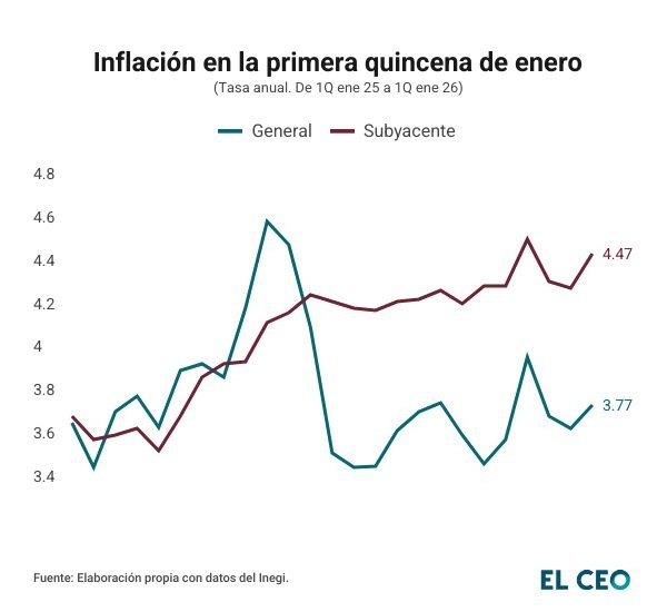 La ‘cuesta de enero’ de este año llega con una presión adicional para el bolsillo de los mexicanos. En la primera quincena de 2026, la inflación general anual repuntó a 3.77%, rompiendo una racha de dos quincenas a la baja, de acuerdo con el Instituto Nacional de Estadística y Geografía (Inegi).