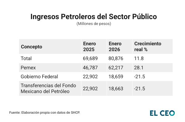 Al interior del reporte de Hacienda, destaca el comportamiento de Petróleos Mexicanos (Pemex). La empresa pública del Estado reportó ingresos propios por 62,200 mdp, lo que representa un salto extraordinario del 28.1% real en comparación con enero de 2025.