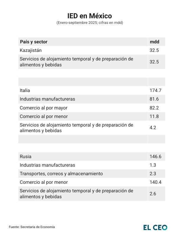 Por otro lado, Italia ocupó el segundo lugar, con una IED estimada en 174.7 mdd, cifra que contrasta con los 21.2 mdd registrados hasta el tercer trimestre pero de 2024. En el caso de Rusia, su inversión alcanzó 146.6 mdd frente a los 19.1 mdd del mismo periodo del año anterior, con lo que se colocó en la tercera posición entre los países con mayor incremento.