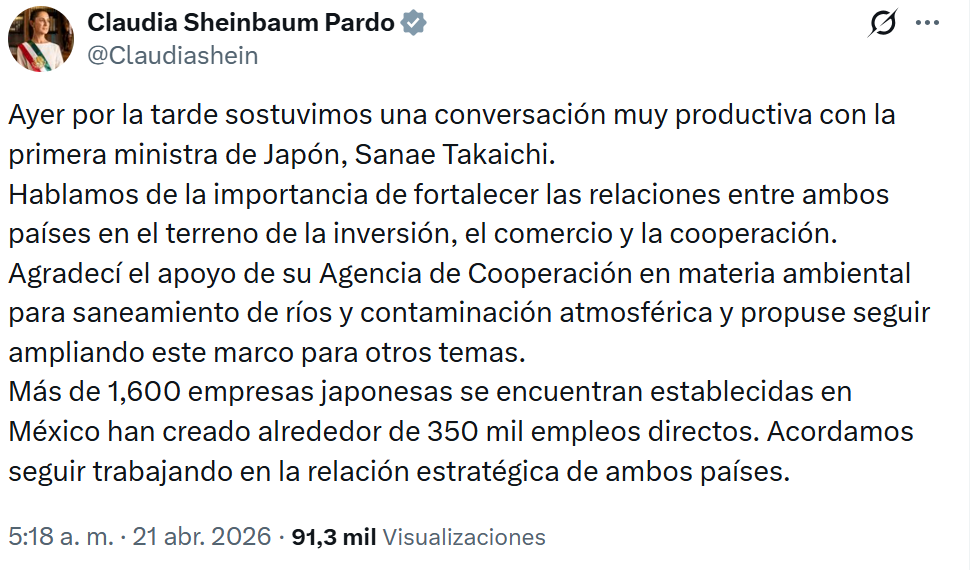 Ayer por la tarde tuvimos una conversación muy productiva con la primera ministra de Japón, Sanae Takaichi. Hablamos de la importancia de fortalecer las relaciones entre ambos países en el terreno de la inversión, el comercio y la cooperación”, señaló Sheinbaum.