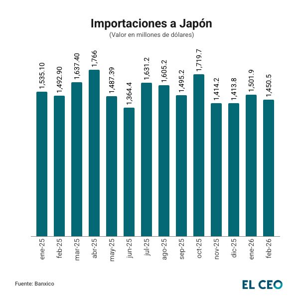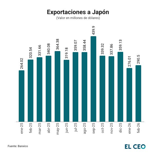 De acuerdo con datos del Banco de México (Banxico), durante 2025 las exportaciones mexicanas con destino a Japón superaron los 4,133 millones de dólares. Por su parte, las importaciones rebasaron los 18,562 millones.