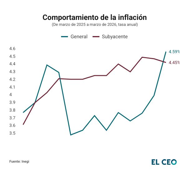 El nivel de la inflación general de marzo es el más elevado desde octubre de 2024, cuando fue de 4.76% anual. Además, la inflación ligó dos meses por encima del rango objetivo del Banco de México (Banxico) de 3% +/- un punto porcentual.