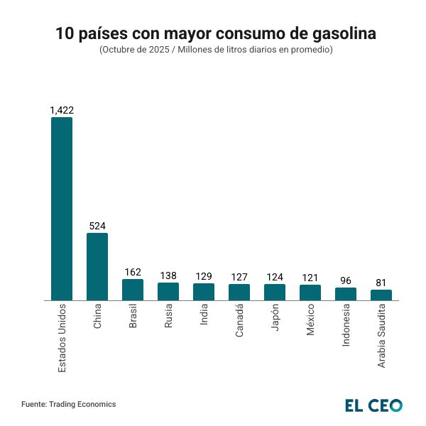 Datos de Trading Economics, durante septiembre y octubre, México se mantuvo como el precio promedio más alto por litro de gasolina al considerar únicamente a los 10 países con mayor consumo de este combustible a nivel mundial.