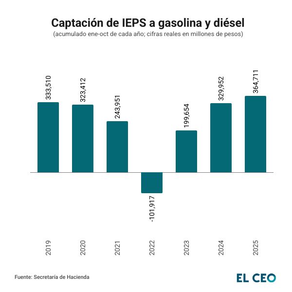 Tan solo en octubre, el gobierno federal captó 44,157 millones de pesos por el IEPS a gasolinas y diésel, un aumento de 9.4% anual en términos reales.