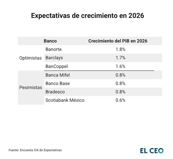 Por ejemplo, de las 32 instituciones financieras consultadas por Citi, Banorte fue el banco con mejor pronóstico para la economía de México en 2026, al proyectar una expansión del PIB de 1.8%. En contraste, Scotiabank México se mostró menos optimista para el desempeño de la economía nacional, con un avance de 0.6%.