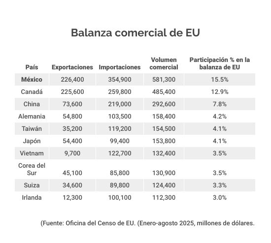 De enero a agosto de 2025, las exportaciones de Estados Unidos a México totalizaron 226,400 mdd, mientras que las importaciones llegaron a los 354,900 mdd, con un volumen comercial de 581,300 mdd y una participación del país en la balanza comercial estadounidense de 15.5%.