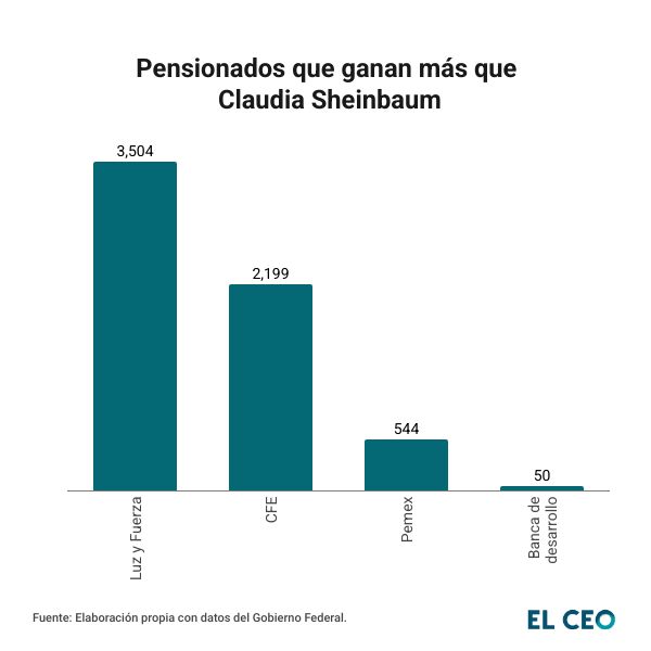 La presidenta Claudia Sheinbaum Pardo busca reducir las “pensiones doradas”, de las cuales, más de 6,000 exfuncionarios de Luz y Fuerza del Centro (LyF), Pemex, CFE, Nafin, Banobras y Bancomext gozan de un ingreso superior a lo que recibe la titular del ejecutivo cada mes.
