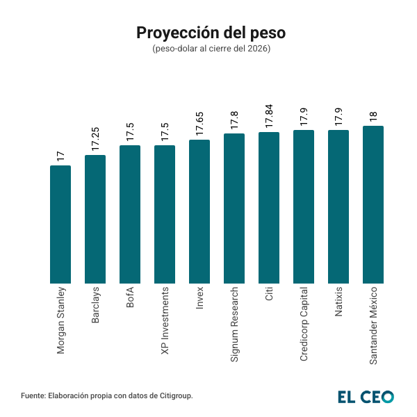 Morgan Stanley prevé que el peso cierre este año en 17.00 unidades por dólar, mientras que Barclays estima un nivel de 17.25 pesos, ambas proyecciones más favorables que el consenso general.