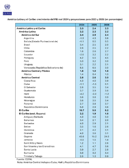 De acuerdo con el balance preliminar de la Cepal, los países con mejor pronóstico para 2026 respecto al crecimiento del PIB son Guyana, con 29%; Antigua y Barbuda, 5%, y Paraguay, 4.5%.