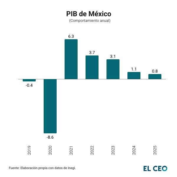 La economía mexicana cerró 2025 con un modesto avance de 0.8% anual, la menor tasa de crecimiento desde 2020, año en que el Producto Interno Bruto del País (PIB) tuvo una contracción de 8.6%, derivado del confinamiento por la emergencia sanitaria.