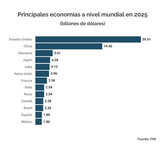 Actualmente, México se ubica en la posición 13 dentro de las principales economías a nivel global, mientras que la décima posición es ocupada por Brasil, que de acuerdo con el Fondo Monetario Internacional (FMI) estará creciendo 2.4% en 2026 y México apenas lo haría 1%.