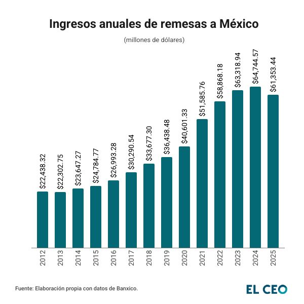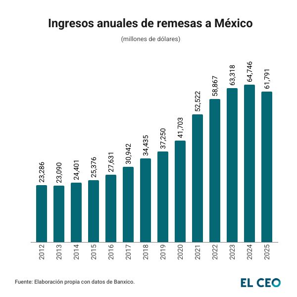 Las remesas enviadas a México sumaron 61,791 millones de dólares (mdd) durante 2025, una disminución de 4.6% respecto a lo reportado un año antes, y la primera caída para un año completo desde 2013, de acuerdo con datos de Banco de México (Banxico).