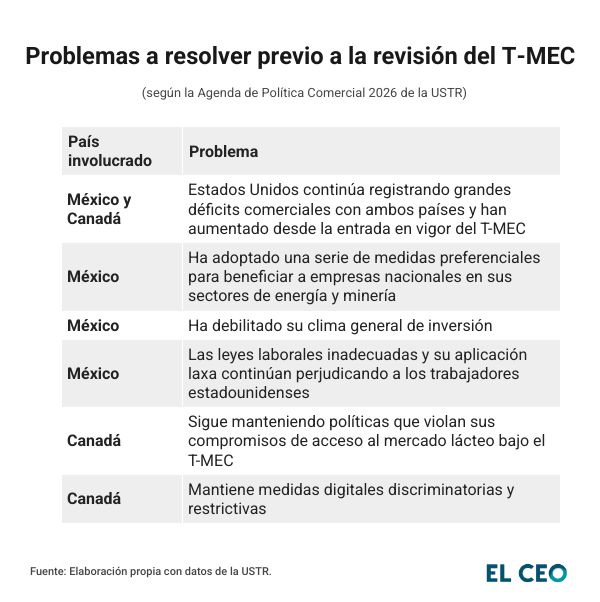 Lo anterior debido a que en la Agenda de Política Comercial 2026 del USTR, si bien se menciona que el T-MEC fue un paso importante para reequilibrar las relaciones económicas con México y Canadá, todavía existen problemas que requieren solución, principalmente en el sector energético.