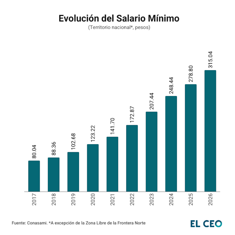 Con este aumento, un trabajador ganaría a partir de 2026 un salario mensual de 9,451.20 pesos en la zona del Salario Mínimo General, mientras que en la Zona Libre de la Frontera Norte será de 13,226.10 pesos respectivamente.