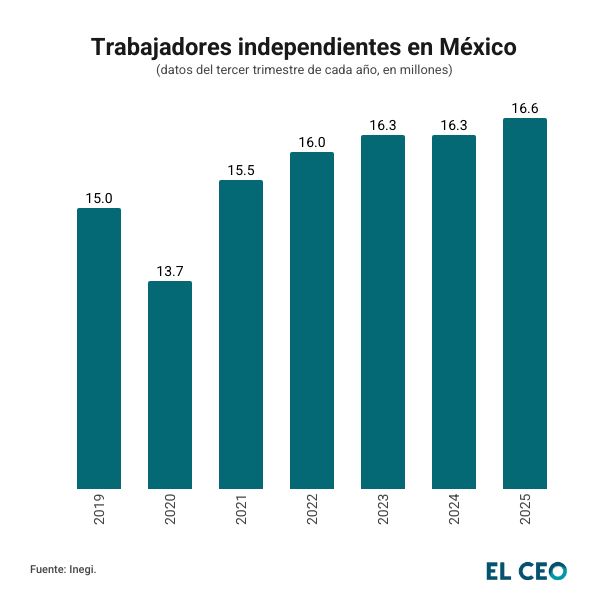 De acuerdo con la Encuesta Nacional de Ocupación y Empleo (ENOE), en el tercer trimestre del 2025 se registraron 16.9 millones de trabajadores independientes o sin empleador.