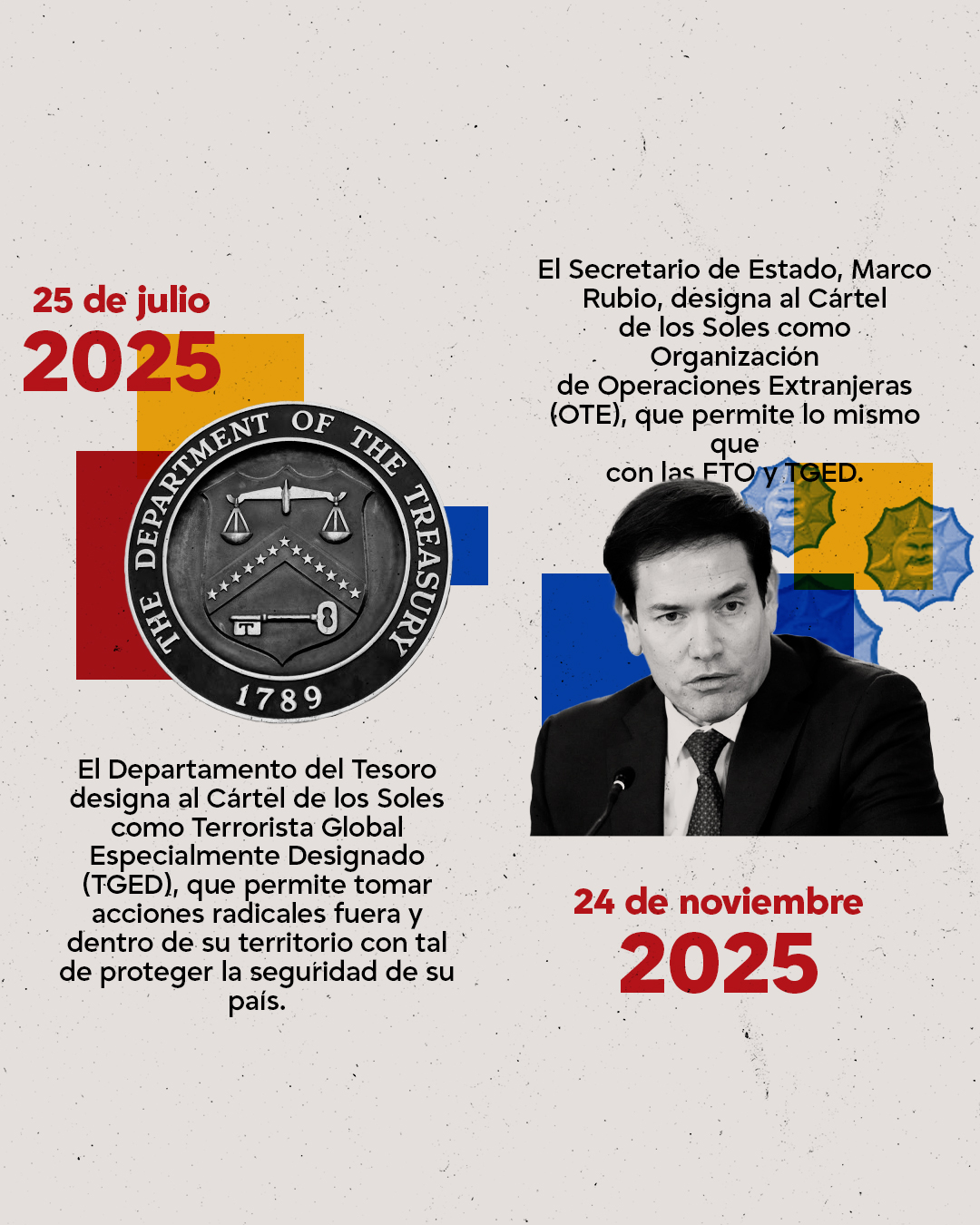 Por ejemplo, en 2020 durante la primera administración de Donald Trump en Estados Unidos, Nicolás Maduro, junto con otros altos funcionarios venezolanos —que supuestamente eran integrantes del Cártel de los Soles— fueron acusados de asociarse con las Fuerzas Armadas Revolucionarias de Colombia (FARC) para traficar cocaína, y “usarla como arma”.