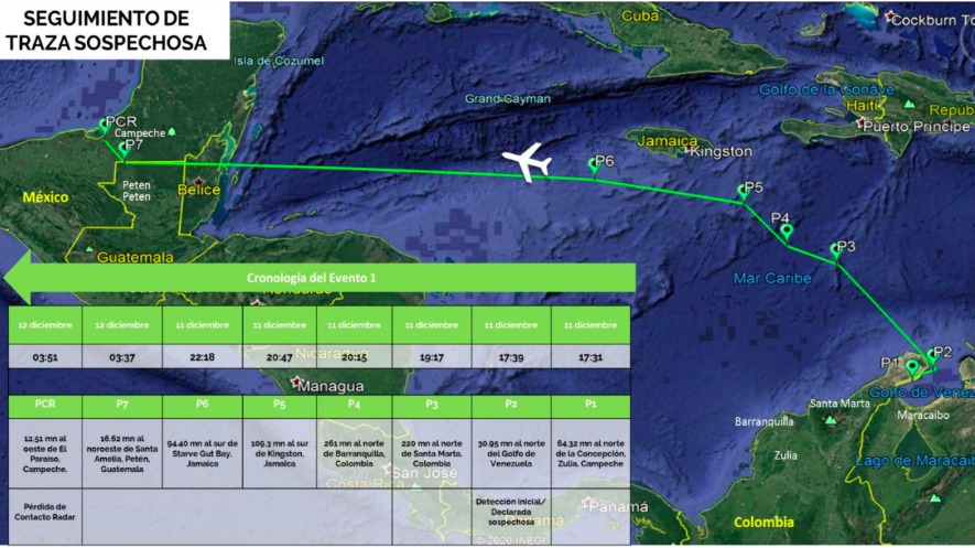 Un día más tarde, la misma aeronave salió de Zulia, Venezuela, y aterrizó en Guatemala. Durante diciembre, ese jet —de matrícula N326TD— realizó 18 trazas aéreas sospechosas, y estuvo monitoreado por diversas autoridades de los países de la región.