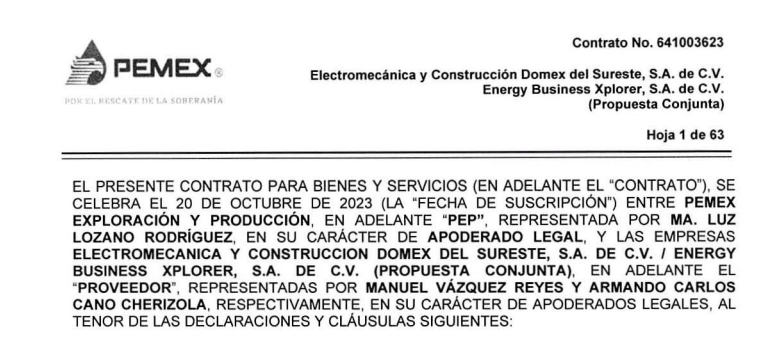 Cabe señalar que en 2023, Electromecánica y Construcción Domex en conjunto con otra empresa llamada Energy Business Xplores obtuvieron otro contrato por 191 millones de dólares; el administrador de esta última sociedad fue Luis Alberto Hinojos Ramírez, un viejo conocido y representante legal de una licitación para exploración y explotación petrolera de Rovirosa en Veracruz.