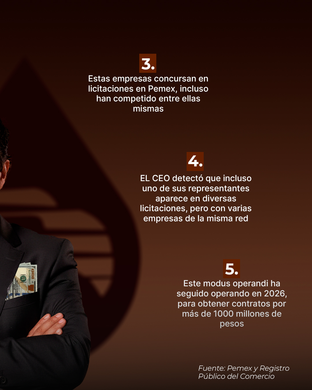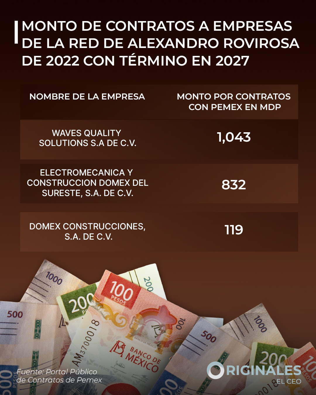 Una investigación de EL CEO revela que Alexandro Rovirosa tiene una red empresarial poco conocida que desde 2022 comenzó a tener nuevos contratos con Pemex. Estas sociedades, cuyos funcionarios son empleados de bajo perfil, han ganado licitaciones por más de 2,000 millones de pesos.