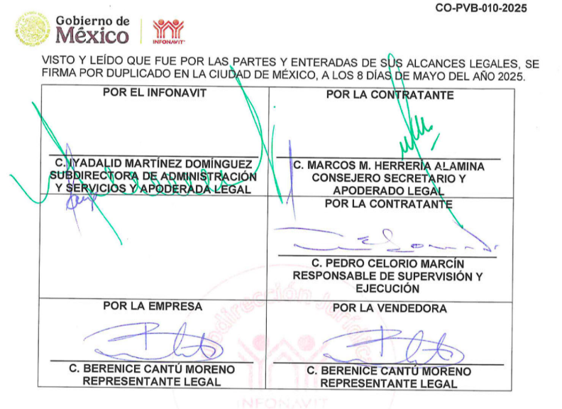 Firma del contrato entre Inmobiliarios Mexicanos y el Infonavit, con fecha 8 de mayo de 2025.