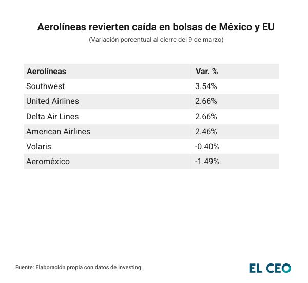 0.40Grupo Aeroméxico y Volaris, las dos aerolíneas que cotizan en la Bolsa Mexicana de Valores (BMV) lograron revertir la caída con la que iniciaron la jornada de este lunes, luego de que el conflicto en Medio Oriente disparó los precios del petróleo por encima de los 100 dólares por barril.