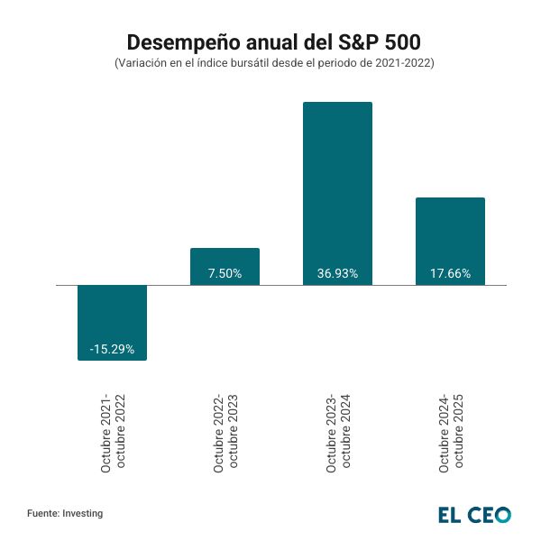 Desde octubre de 2022 y hasta el mismo mes de 2025, el índice bursátil de las 500 empresas con mayor capitalización de Estados Unidos ha registrado una ganancia del 75.43%, de acuerdo con datos de Investing.