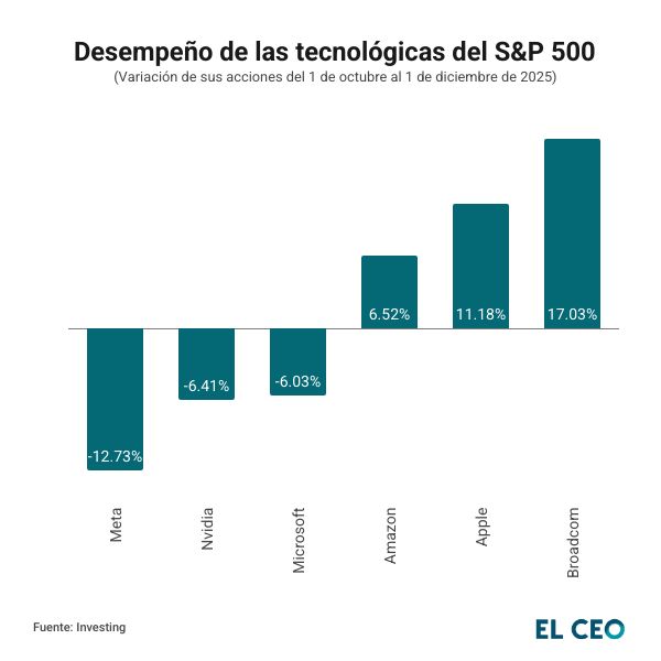 Las estimaciones para las tecnológicas contrasta con el desempeño que han tenido estas compañías en los últimos dos meses, desde el 1 de octubre hasta el 1 de diciembre de 2025, donde han registrado pérdidas por el miedo a la posible sobrevaloración