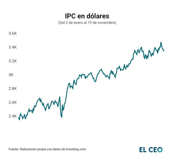 Ese mismo día el IPC alcanzó los 3,510.32 dólares, de acuerdo con cálculos de EL CEO con datos de Investing.com, un desempeño no visto desde abril de 2013. Con ello se posicionó cerca de su máximo histórico del 11 de abril de ese año, cuando alcanzó los 3,687.49 dólares.