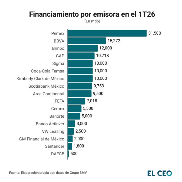 Durante el trimestre, las principales emisiones de deuda de largo plazo fueron lideradas por tres empresas: la petrolera estatal Petróleos Mexicanos (Pemex); BBVA México, el mayor prestamista del país, y Grupo Bimbo, la panificadora más grande a nivel mundial.