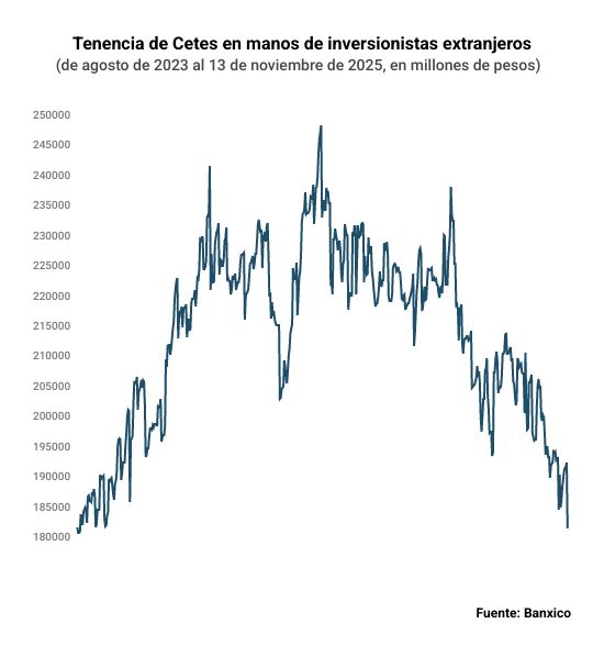 Al corte del 13 de noviembre, la tenencia de foráneos en Cetes totalizó 182,381 millones de pesos (mdp), de acuerdo con datos de Banxico, el nivel más bajo desde el 28 de agosto de 2023, cuando el banco central reportó 182,780 mdp en manos de extranjeros.