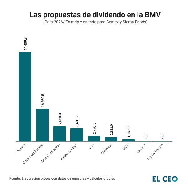 Por monto, el conglomerado de consumo FEMSA y su embotelladora, Coca-Cola FEMSA, encabezan la propuesta de dividendos.